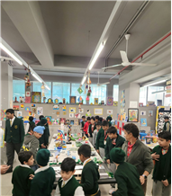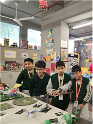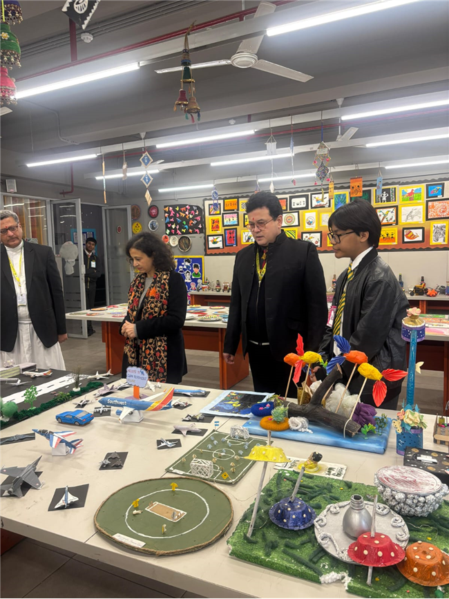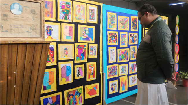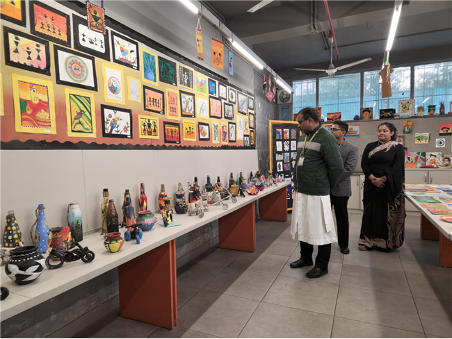 • In line with the school’s commitment to sustainability, many exhibits reflected the theme of reuse and recycling. Notable installations included “Dali-inspired Melting Clocks Tree” by Class 9, Zentangle Cubes by Classes 9 and 10, POP Art Installation by Class 9, Cubist Faces Installation by Classes 4 and 5, Mandala Motif Plates by Class 5, Cubist Faces by Class 8, and “Wings” by Class 10, created using repurposed materials such as paper, cardboard, and scrap to promote the concept of “art out of waste.”
