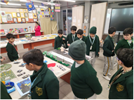 • The middle school foyer and art room were transformed into an art gallery, with exhibits thoughtfully displayed on easel stands, boards, and installations throughout the foyer and art room.