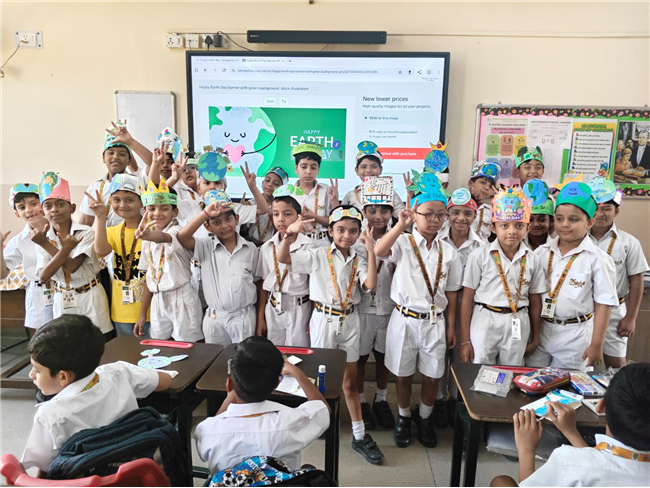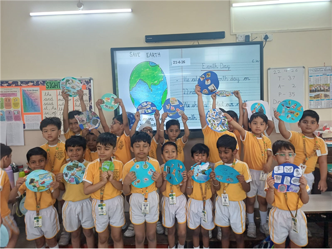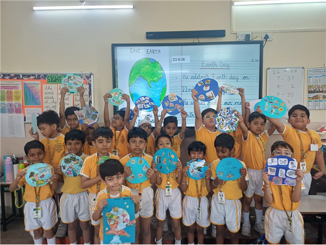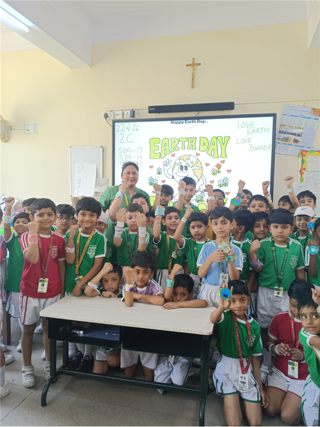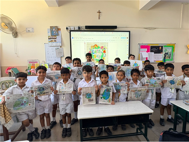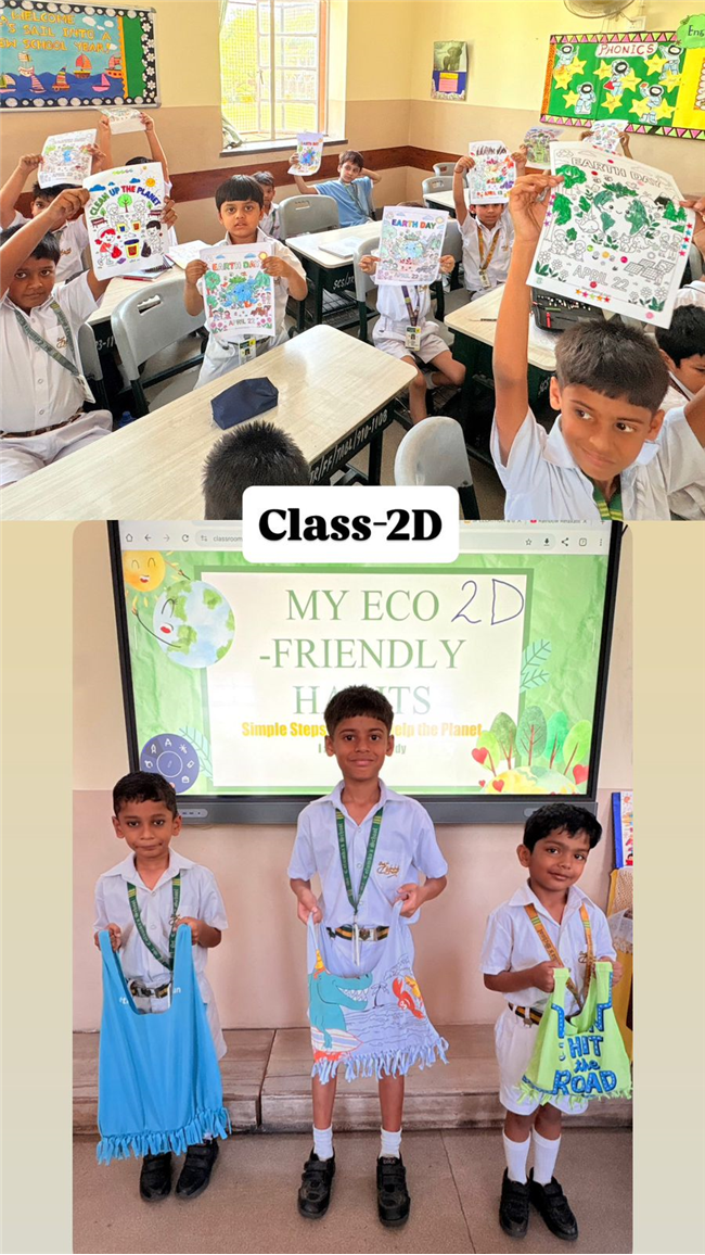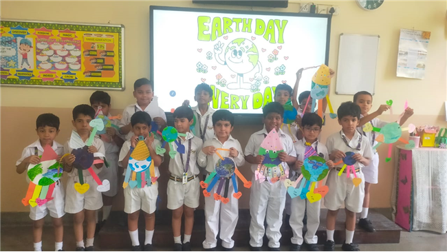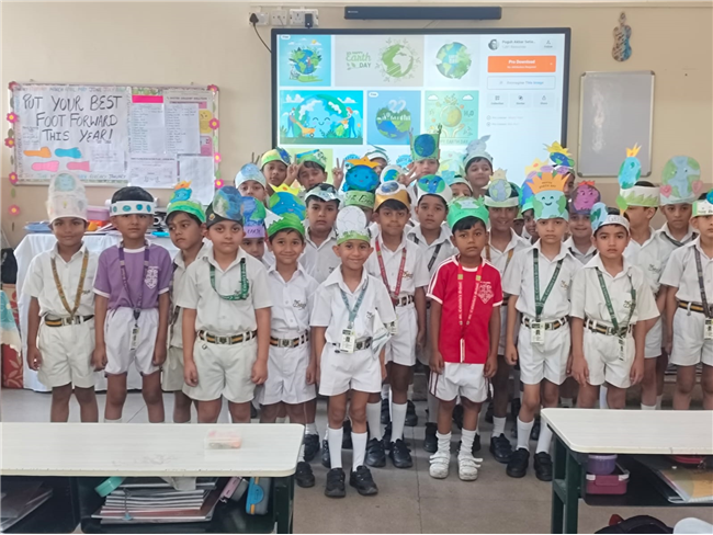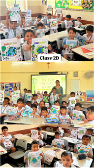 Boys of Class 2A wrote ways to protect the earth on leaf cutouts, assembling them into an Eco-Friendly Acts Tree alongside crafting earth-themed bookmarks, whereas Class 2B expressed the spirit of recycling through colourful drawings on newspaper. Enthusiastically joining in, Class 2D upcycled old T-shirts into cloth bags and designed vibrant posters championing reuse and sustainability, while Class 2E made headgear and pledged to switch off fans and lights when not in use. Adding their own creative touch, Class 3A created posters with the slogan 'Love Your Planet' and made hand imprints highlighting five ways to save the earth. Not to be left behind, Class 3B crafted colourful nature crowns celebrating trees, water and the planet, while Class 3D designed Earth Day Bingo Cards with thoughtful ways to protect Mother Earth. Rounding it all up beautifully, Class 3E put together vibrant wall hangings carrying messages on saving water, planting trees and reducing waste — each a heartfelt pledge for a greener future.