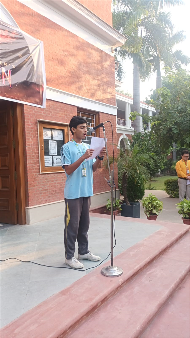 Class XII-D presented an insightful assembly on the theme “Pause and Think for Yourself.” The students highlighted how people often react automatically to social media, advertisements, and peer pressure without realizing it. They stressed the need to pause, reflect, and make conscious choices guided by reason and awareness. The assembly encouraged students to think independently and act mindfully, earning appreciation from both teachers and peers.