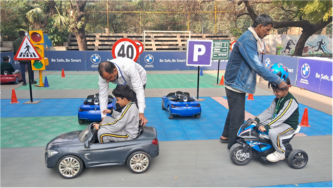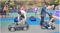 A major highlight of the workshop was the traffic park simulation set up on the school premises. Using child-friendly battery-operated bikes and cars, students experienced real-life traffic situations. They practised stopping at signals, following lane rules, giving way to pedestrians, and respecting road signs, thereby strengthening discipline and decision-making skills in a fun environment.